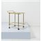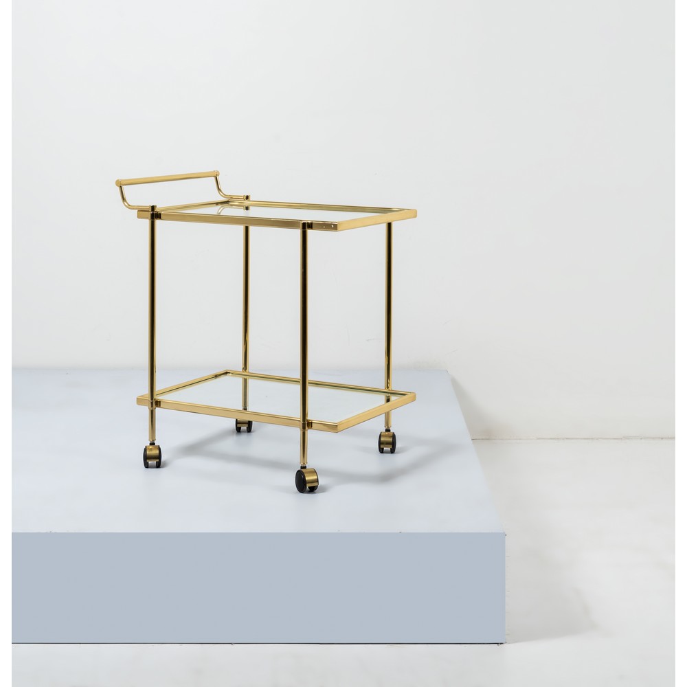 Carrello da servizio con struttura in ottone, due ripiani in vetro incolore trasparente, ruote in abs e metallo dorato.