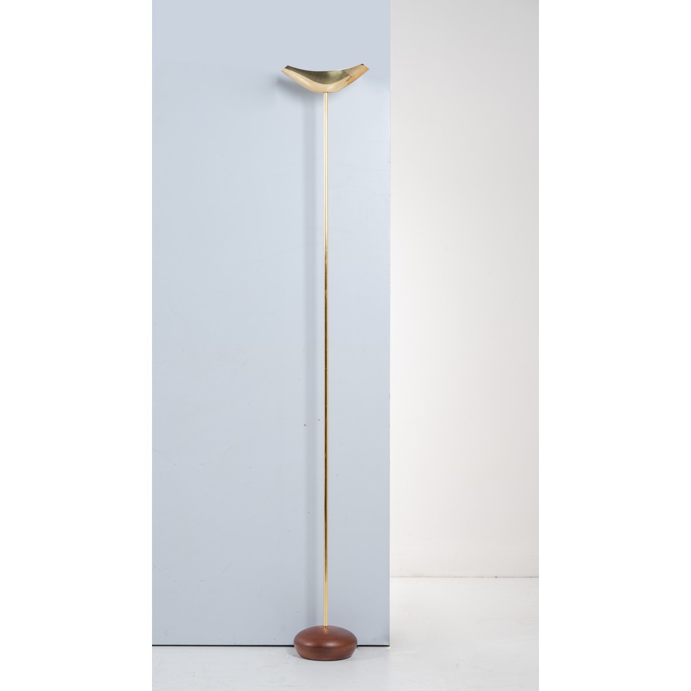 Lampada da terra ad una luce modello "Servil F", stelo e diffusore in metallo dorato, base circolare in legno.