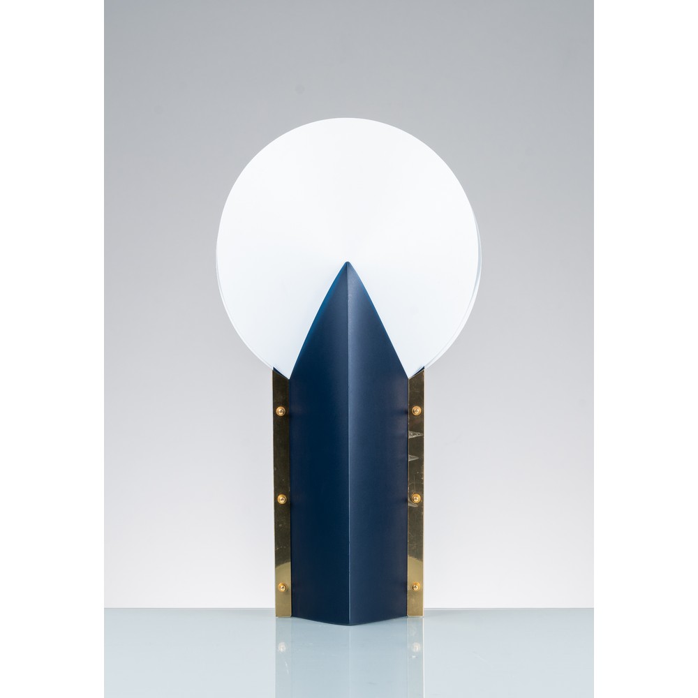 Lampada da tavolo ad una luce modello “Moon”, struttura in materiale plastico ed ottone, diffusore circolare bianco. Etichetta di produzione.