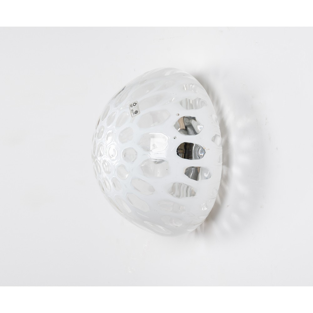 Lampada da soffitto o parete ad una luce, struttura in metallo con diffusore in vetro a decoro lattimo e incolore. Etichetta di produzione.