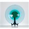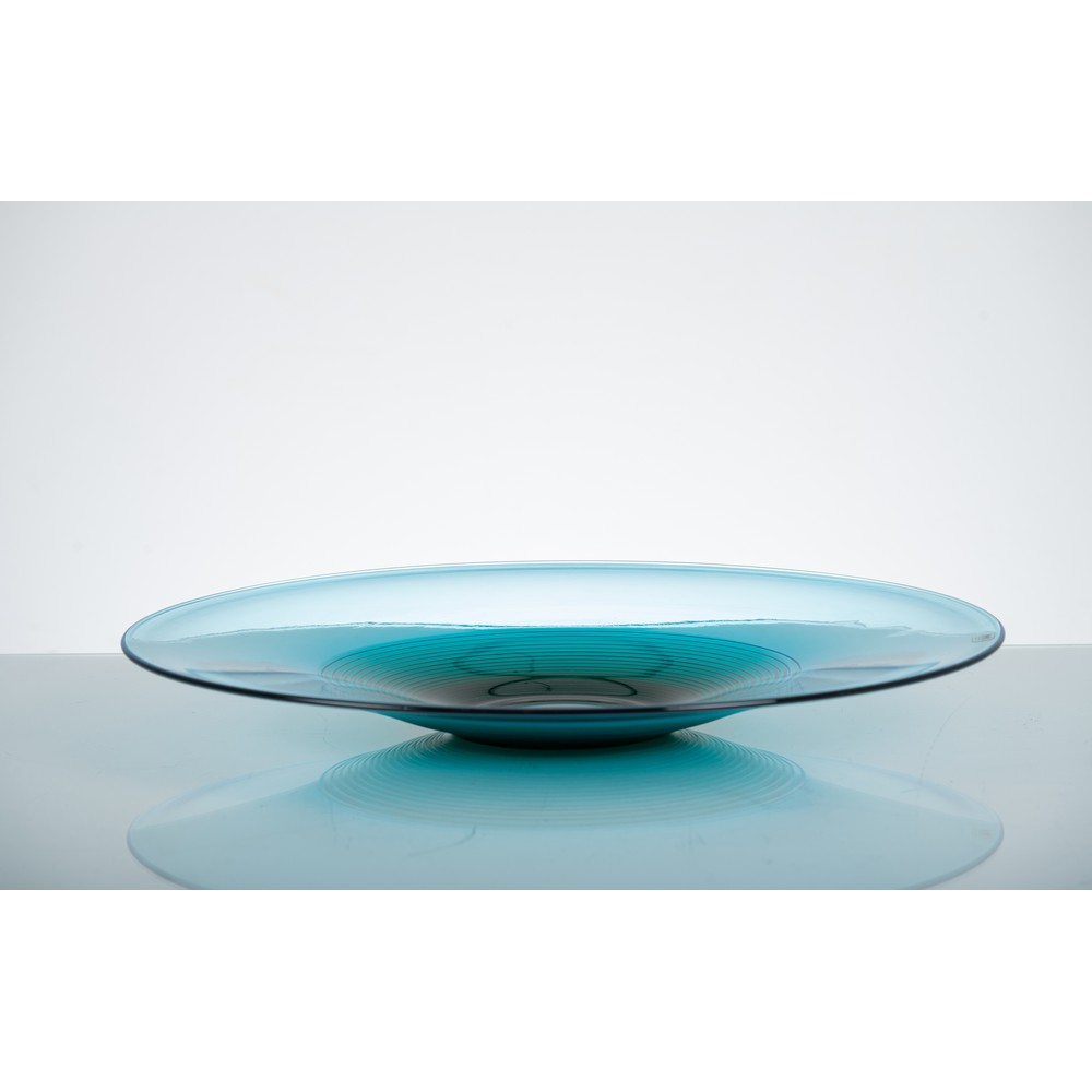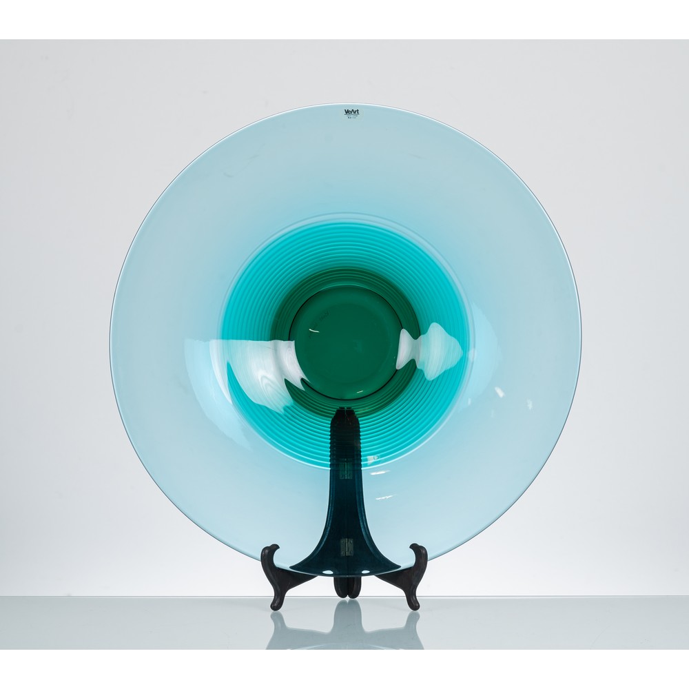 Piatto in vetro azzurrino soffiato e molato, parte centrale verde smeraldo. Etichetta adesiva Veart e firma incisa a graffio.