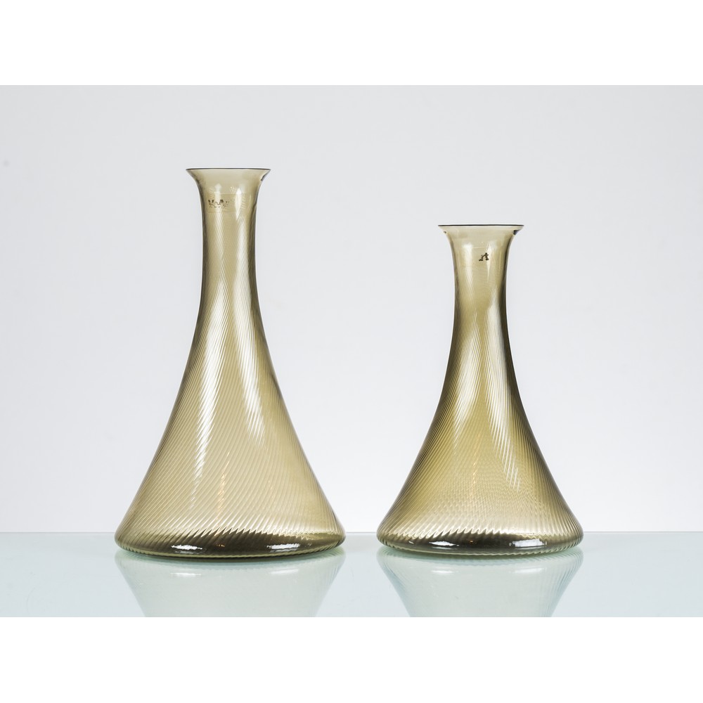 Due vasi di altezze differenti in vetro soffiato fumè, corpo conico. Marchio di produzione.
