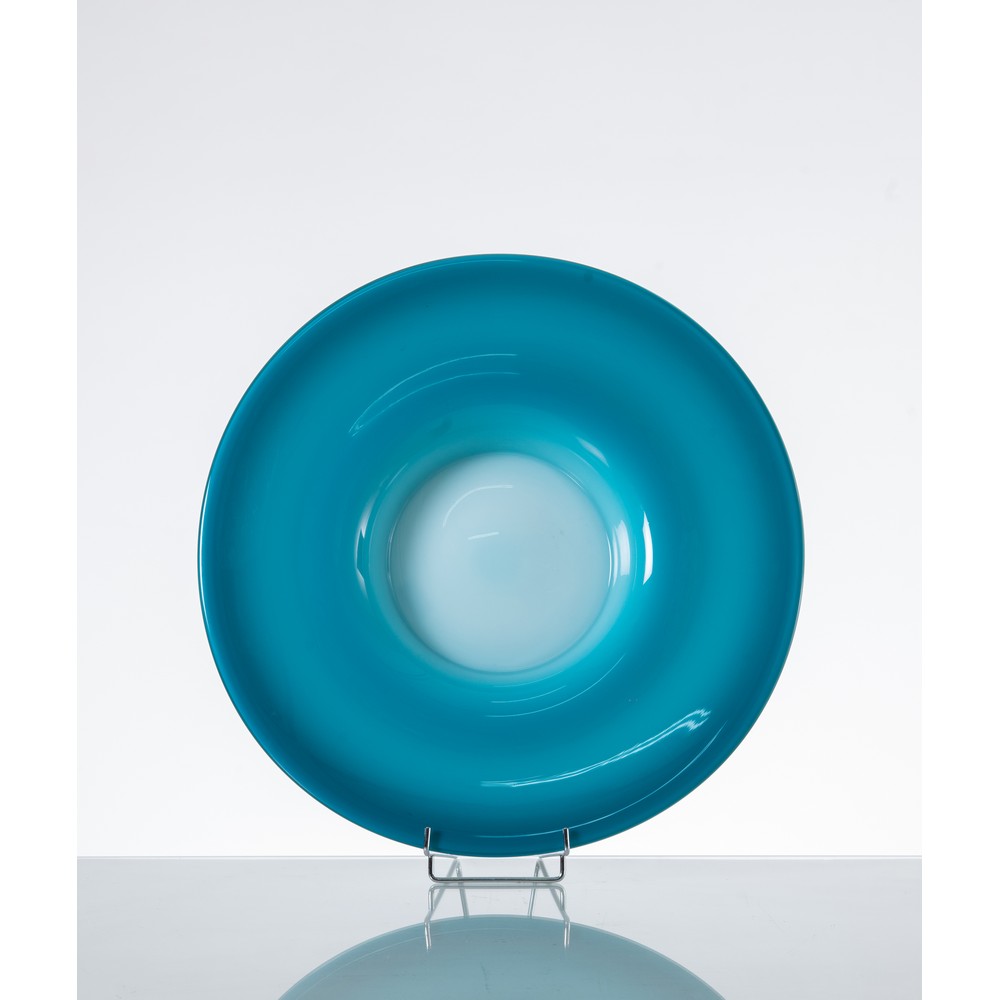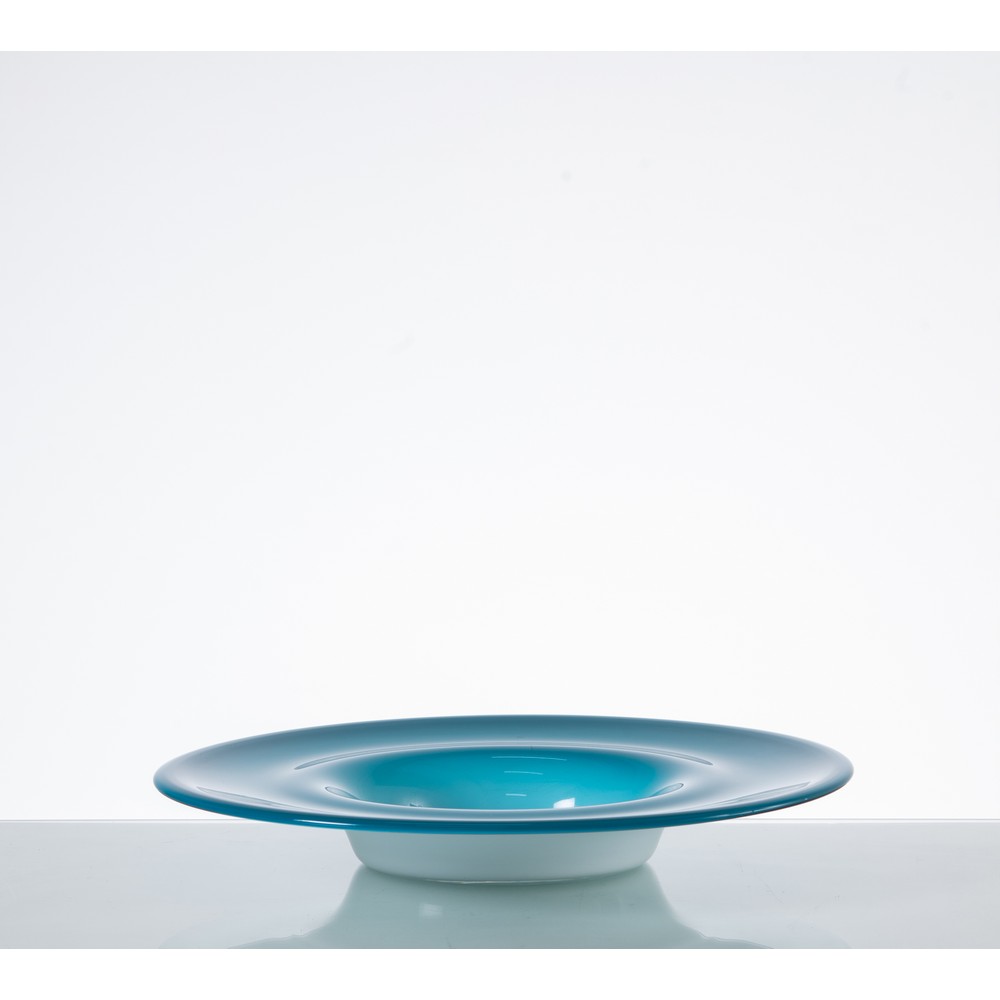 Grande piatto in vetro incamiciato blu e bianco, corpo circolare con fondo a vasca.