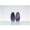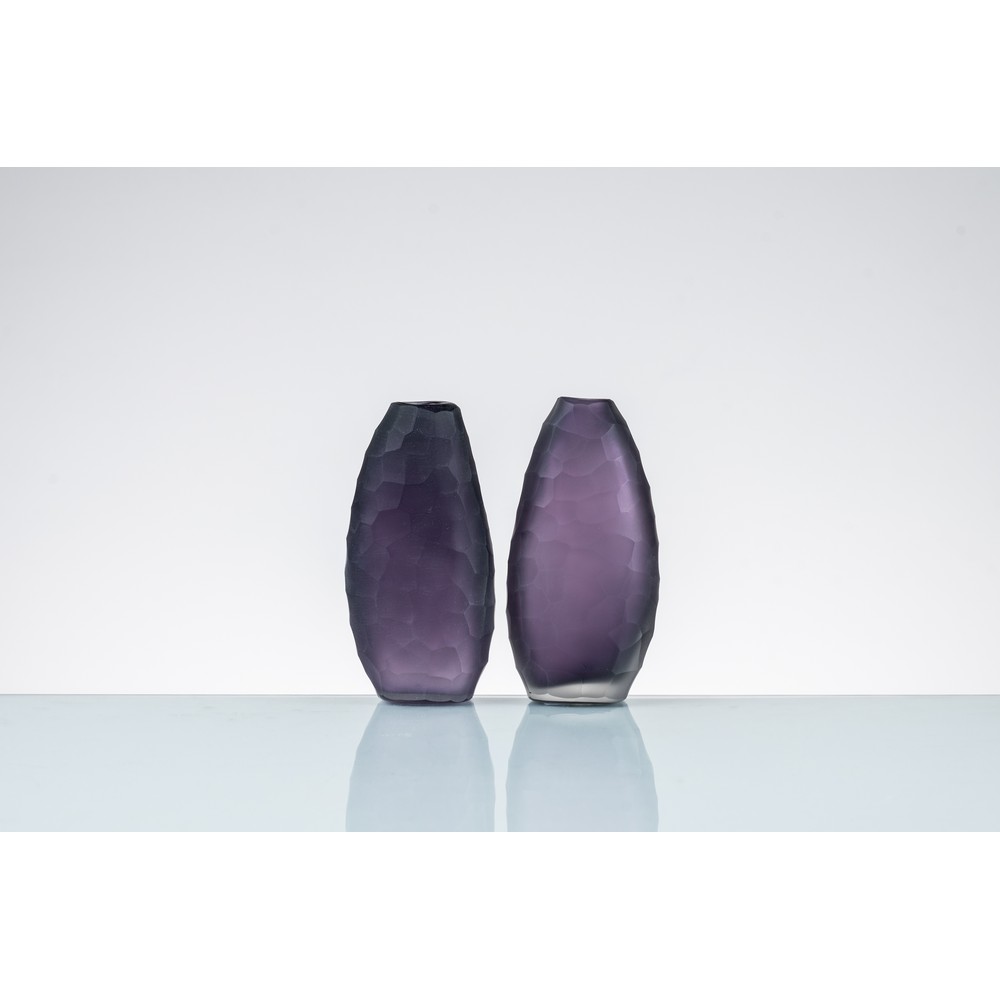 Coppia di vasi in vetro viola satinato, corpo a goccia informe con superficie decorata da grosse sfaccettature, bocca ovalizzata.