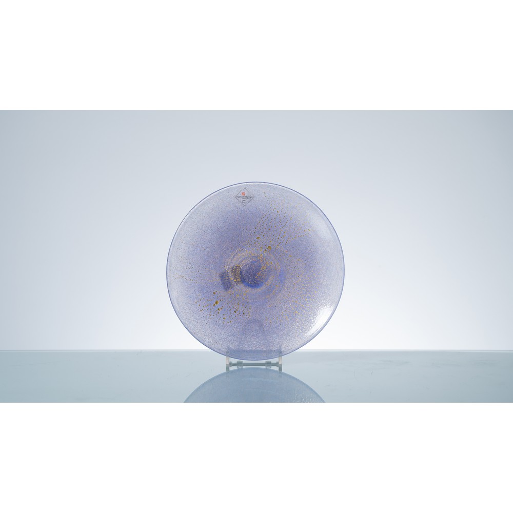 Piatto circolare in vetro ametista decorato con foglia oro. Etichetta di produzione con numerazione 25769, firma a punta Barovier e Toso.