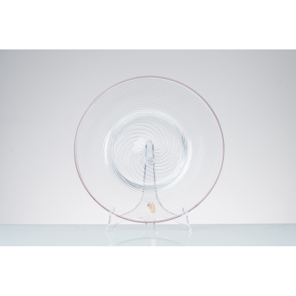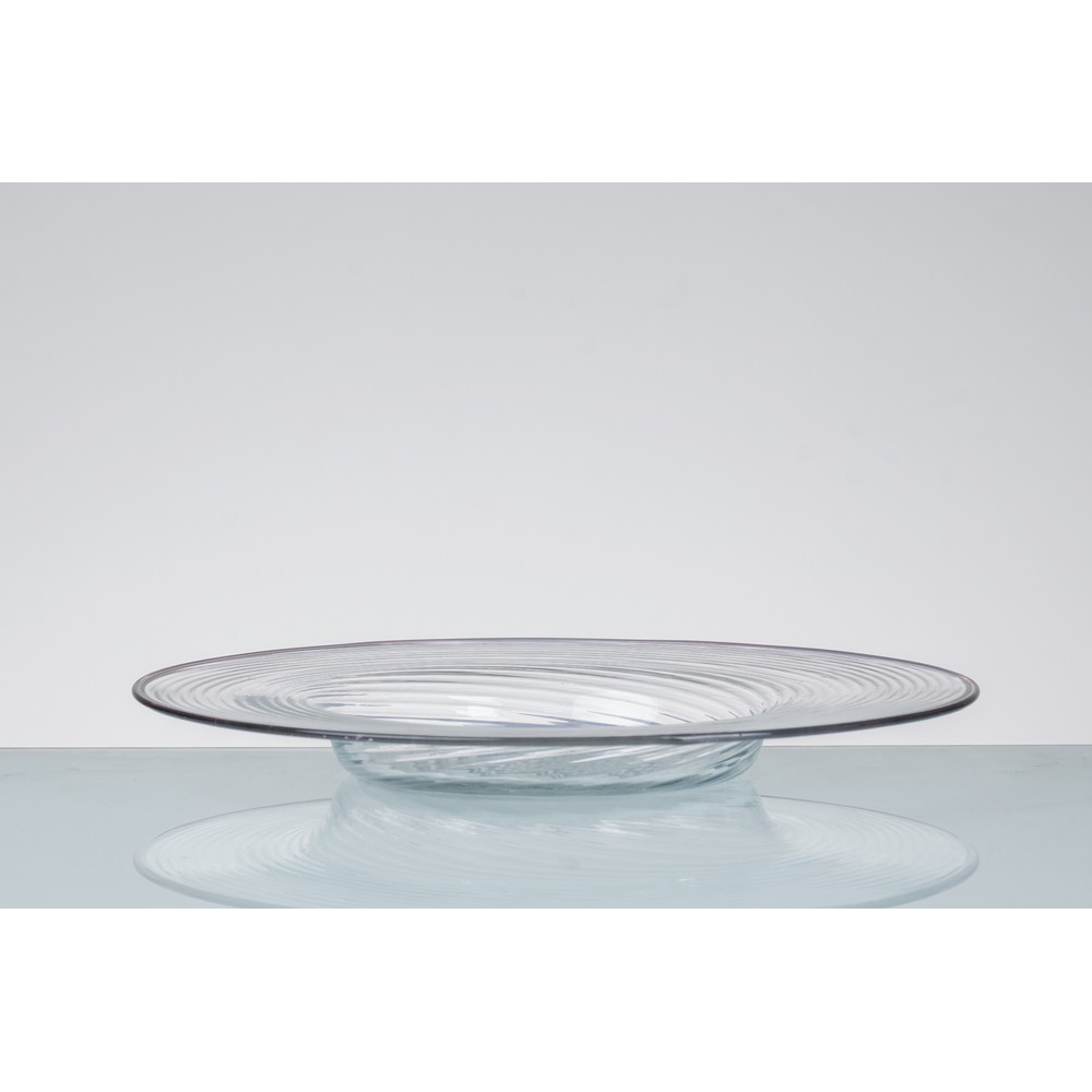 Centrotavola in vetro rigadin incolore, corpo circolare con cavità centrale, bordura color seppia.