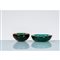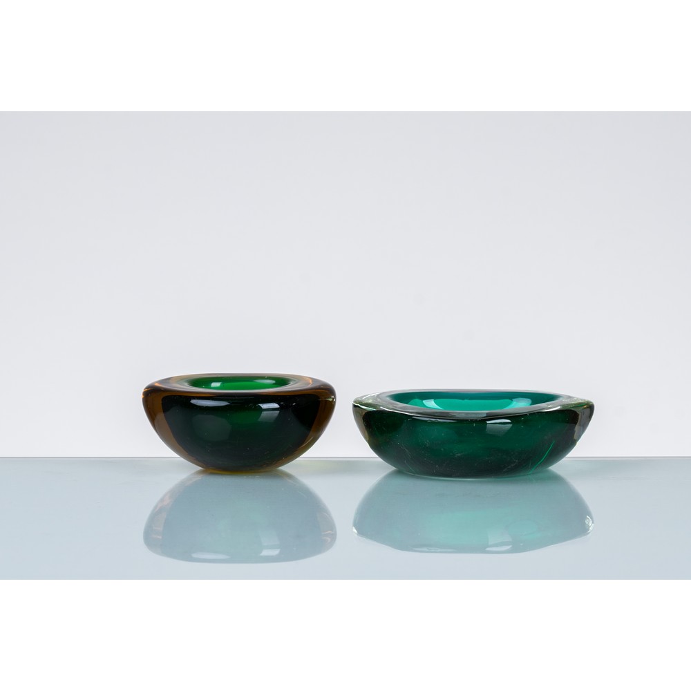 Due posacenere di grandezza differente in vetro sommerso uno giallo e verde ed uno verde, corpo triangolare con angoli arrotondati.