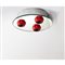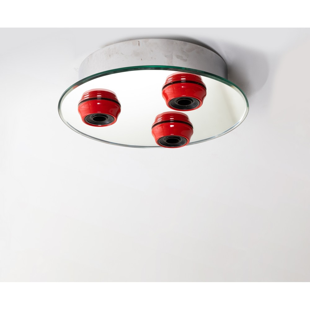 Lampada da soffitto o parete a tre luci con struttura in metallo, diffusore circolare in cristallo specchiato con portalampade in abs rosso.