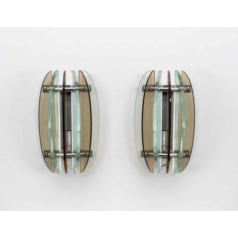 Coppia di lampade da parete ad una luce con struttura in metallo cromato, diffusore ovalizzato in lastre di vetro trasparente e fumè sagomate.