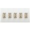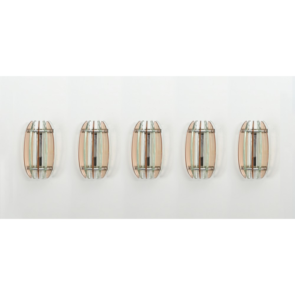 Cinque lampade da parete ad una luce con struttura in metallo cromato, diffusore ovalizzato in lastre di vetro trasparente e rosato sagomate.
