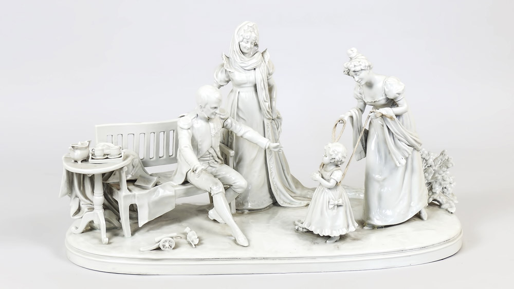 GRANDE GRUPPO IN PORCELLANA Capodimonte, prima metà del XX secolo raffigurante Napoleone Bonaparte in un interno con due figure femminili ed il piccolo Re di Roma, difetti e mancanze cm 25x45x20 Marcato N coronata in sottosmalto blu e numero impresso PORCELAIN FIGURAL GROUP, CAPODIMONTE, FIRST HALF OF 20TH CENTURY