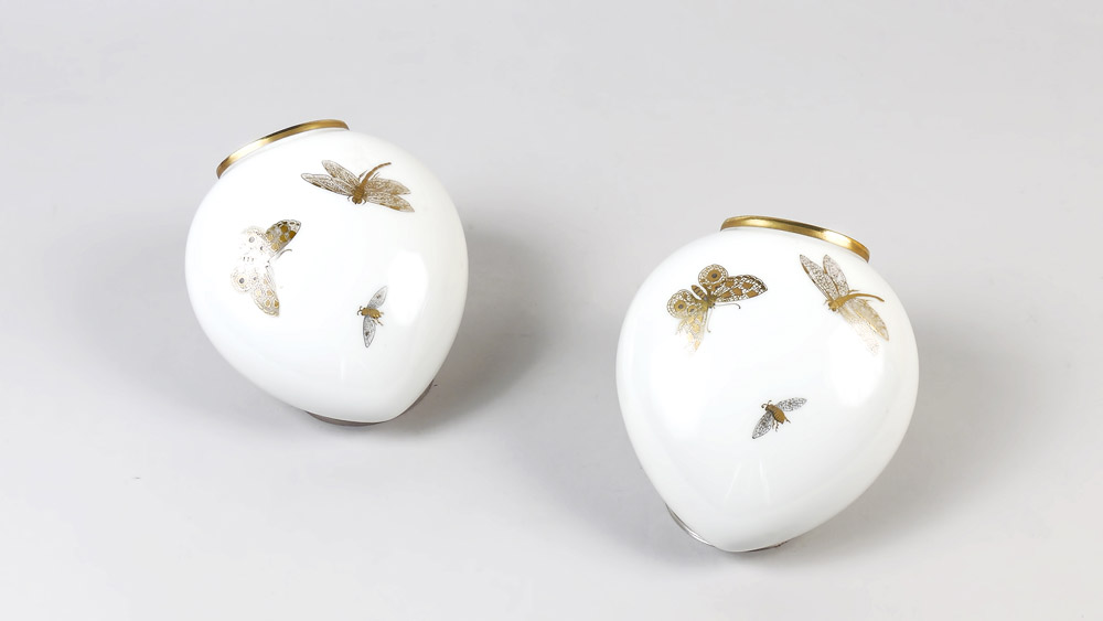 COPPIA DI FIORIERE PENSILI IN PORCELLANA realizzate come due fiasche di forma ovale dipinte con farfalle, libellule ed altri insetti in oro, con laccetti in cuoio PAIR OF PORCELAIN WALL VASES