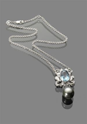 GIROCOLLO Girocollo in oro bianco con una perla Tahiti a goccia di diametro 15,50 mm ed un topazio azzurro ovale di ct. 10 circa con diamanti taglio brillante per complessivi ct. 0,42 peso gr. 27 white gold necklace with 15,50 mm Tahitian teardrop and oval lightblue topaz approx total 10 kt. with brillant cut diamonds totaling 0,42 kt weight grams. 27