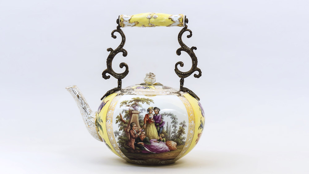 TEIERA IN PORCELLANA Meissen, fine del XIX secolo corpo sferico, presa realizzata ad imitazione di un ramo rilegata in bronzo, interamente dipinta con scene di dame e cavaliere in giardini di gusto arcadico alternate a fasce dipinte con motivi floreali policromi su fondo giallo h cm 25 Marcata con simbolo grafico in sottosmalto blu PORCELAIN TEAPOT, MEISSEN, LATE 19TH CENTURY