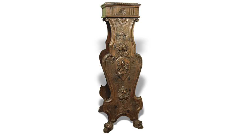 MENSOLONE PORTA SCULTURE IN NOCE inizio del XX secolo realizzato in stile neorinascimento, intagliato a grottesche h cm 118 WALNUT GUERIDON