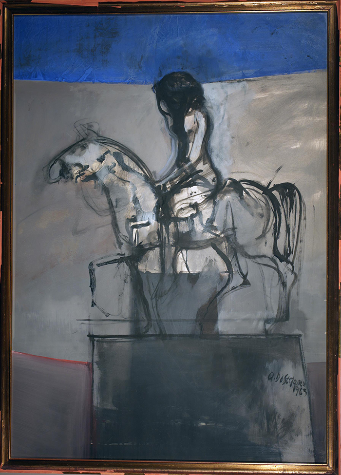 De Stefano Armando (Napoli 1926-2021) Figura a cavallo tempera su carta, cm 92x66 firmato e datato a lato al destra:A. De Stefano 1963