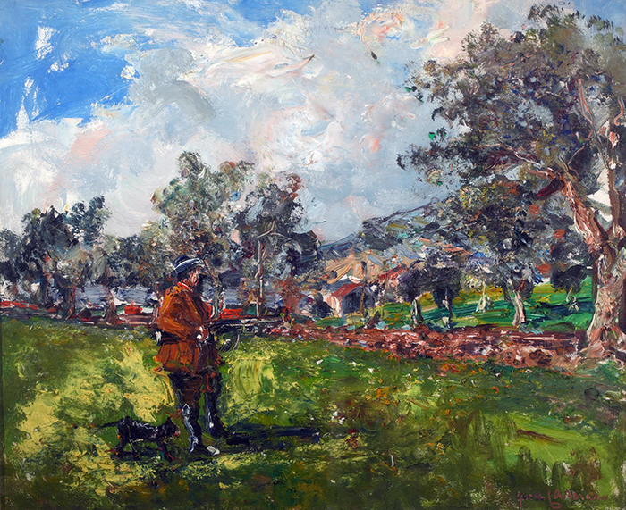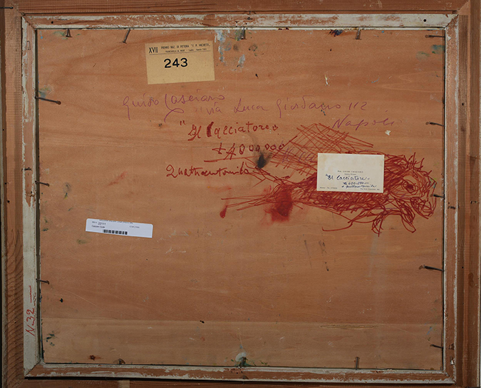 Casciaro Guido (Napoli 1900 - 1963) Il cacciatore olio su tavola, cm 50x60 firmato in basso a destra: Guido Casciaro a tergo: Cartiglio XVII Premio Nazionale di pittura F.P. Michetti, Francavilla a Mare Luglio - Agosto 1963 Esposizioni: Francavilla a Mare,1963 Bibliografia: Cat. XVII Premio Nazionale di pittura F.P. Michetti, Francavilla a Mare 1963