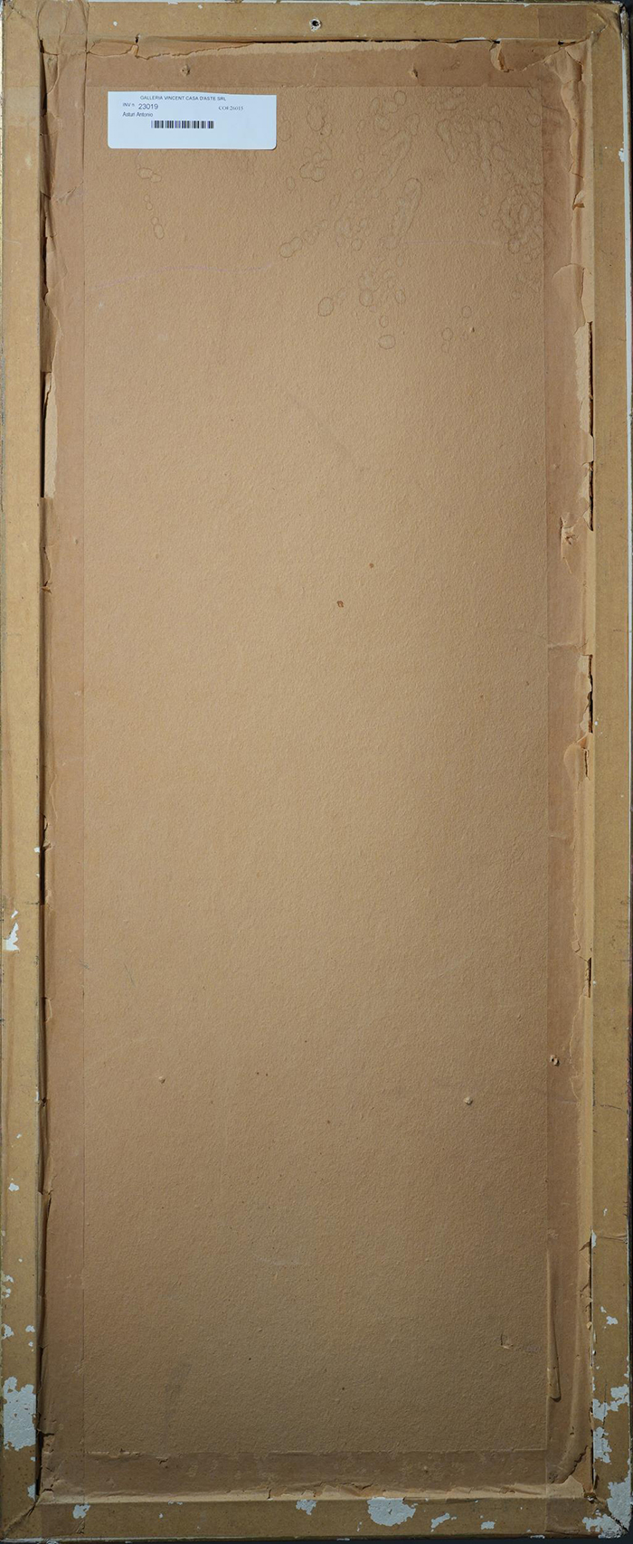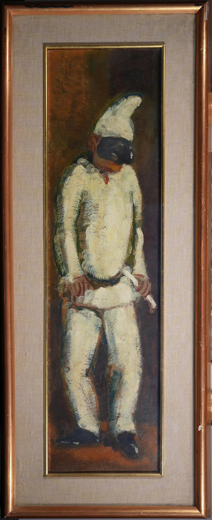 Asturi Antonio (Vico Equense, NA 1904 - 1986 ) Pulcinella olio su cartone cm 74x20 firmato in basso a sinistra: Asturi A. in alto a sinistra iscritto : Al dott. Giannella con affetto e stima Asturi A 1960