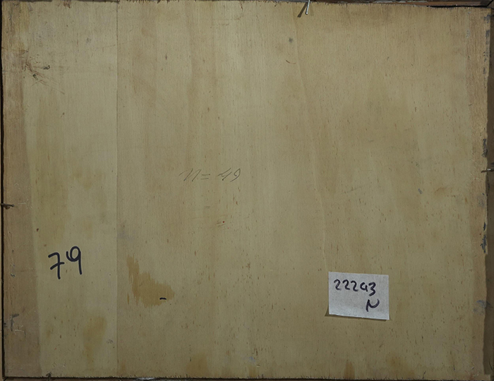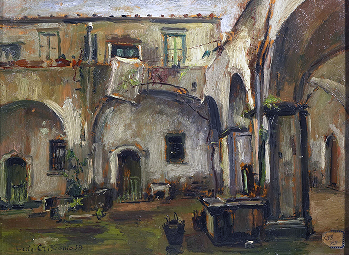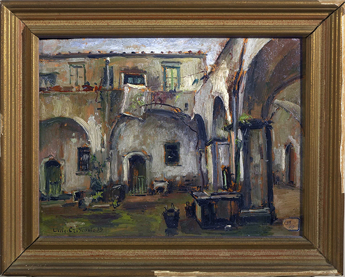Crisconio Luigi (Napoli 1893 - Portici,NA 1946) Interno di cortile a Meta olio su tavola, cm 30x40 firmato e datato in basso a sinistra: L. Crisconio 39