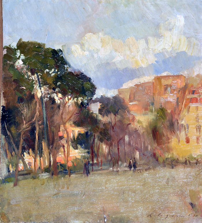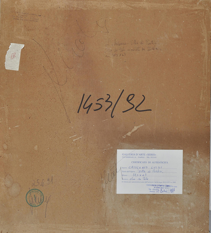 Crisconio Luigi (Napoli 1893 - Portici,NA 1946) Villa di Portici olio su tela rip. su cartone cm 43x38 firmato e datato in basso destra: L Crisconio 1920 a tergo cartiglio Galleria d'Arte Serio, Napoli
