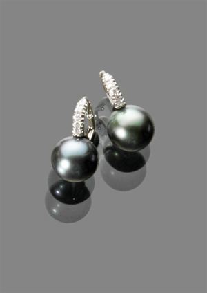 COPPIA DI ORECCHINI Coppia di orecchini in oro bianco con perle tahiti e 10 diamanti taglio brillante per complessivi ct 0,23 peso gr 7,30 Pair of white gold earrings with Tahitian pearls and 10 brillant cut diamonds totaling 0,23 kt weight 7.30 grams