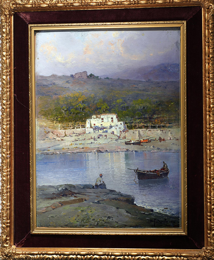 Petruolo Salvatore (Catanzaro 1857 - Napoli 1942) Marina olio su tela, cm 39x29 firmato e datato in basso a destra: S. Petruolo 1912