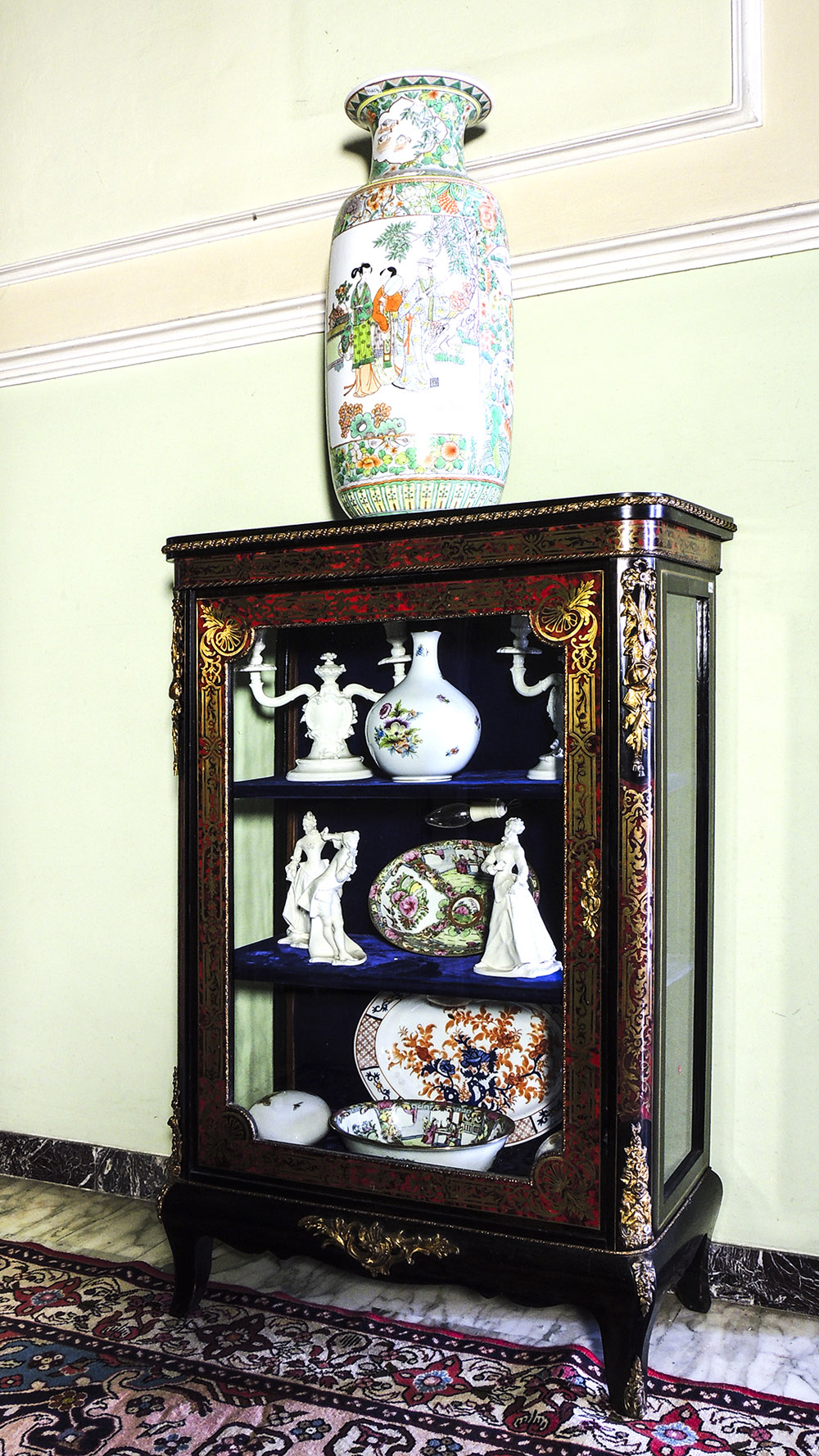 COPPIA DI VETRINE IN LEGNO EBANIZZATO fine del XIX/inizio del XX secolo intarsiate in ottone e tartaruga in stile Boulle, piedi a sciabola, applicazioni in bronzo dorato h cm 113x72x37 PAIR OF EBONIZED WOOD CABINETS