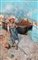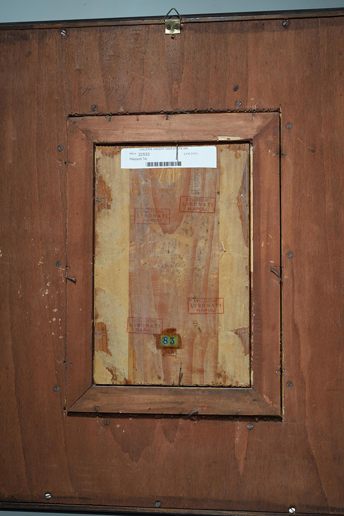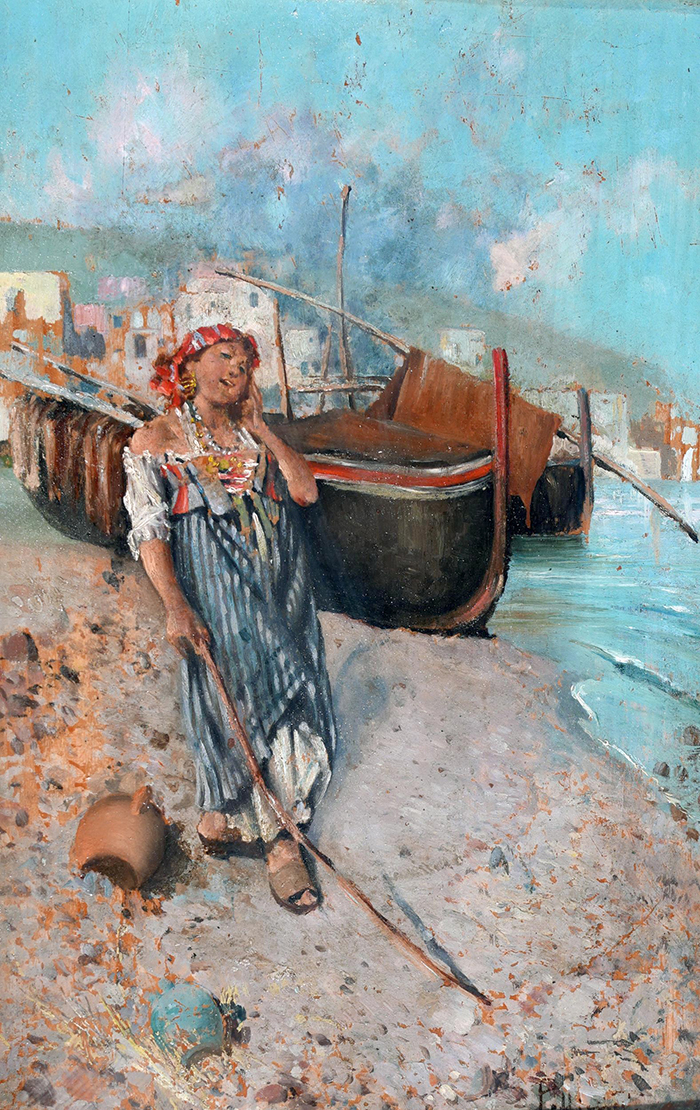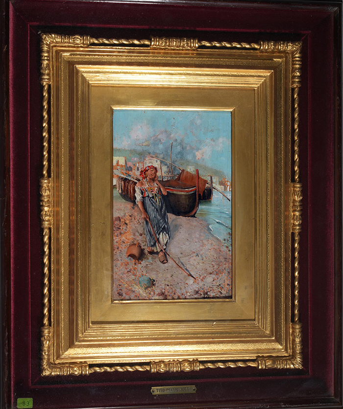 Pellicciotti Tito (Barisciano, AQ 1871 - 1950) Ragazza sull'arenile olio su tavola, cm 25x16,5 firmato in basso a destra: Pellicciotti