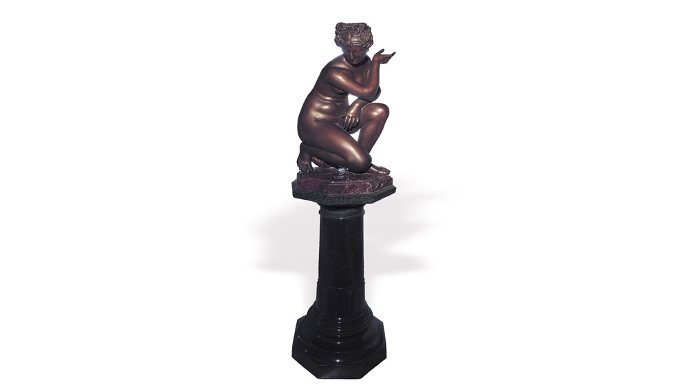 VENERE ACCOVACCIATA inizio del XX secolo scultura in bronzo realizzata a grandezza naturale e ispirata ad un modello ellenistico di Doidalsa, ai piedi della figura vaso in marmo rosso come la base ottagonale, su piedistallo a colonna in marmo verde di Prato h totale cm 183, scultura h cm 81x45x33 circa CROUCHING VENUS, BRONZE SCULPTURE ON MARBLE COLUMN