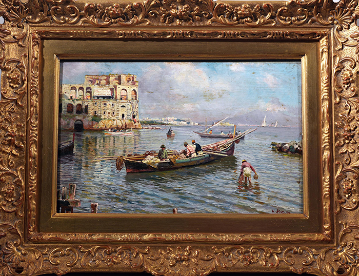 Pratella Attilio (Lugo di Romagna, RA 1856 - Napoli 1949) Marina con pescatori a Palazzo Donn'Anna olio su tavola, cm 22,5x35 firmato in basso a destra: A. Pratella