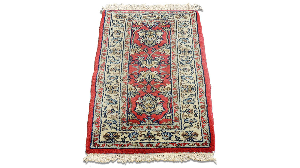 Lotto 47 | PICCOLO TAPPETO CAUCASICO fondo rosso, campo con motivi vegetali nei toni del...