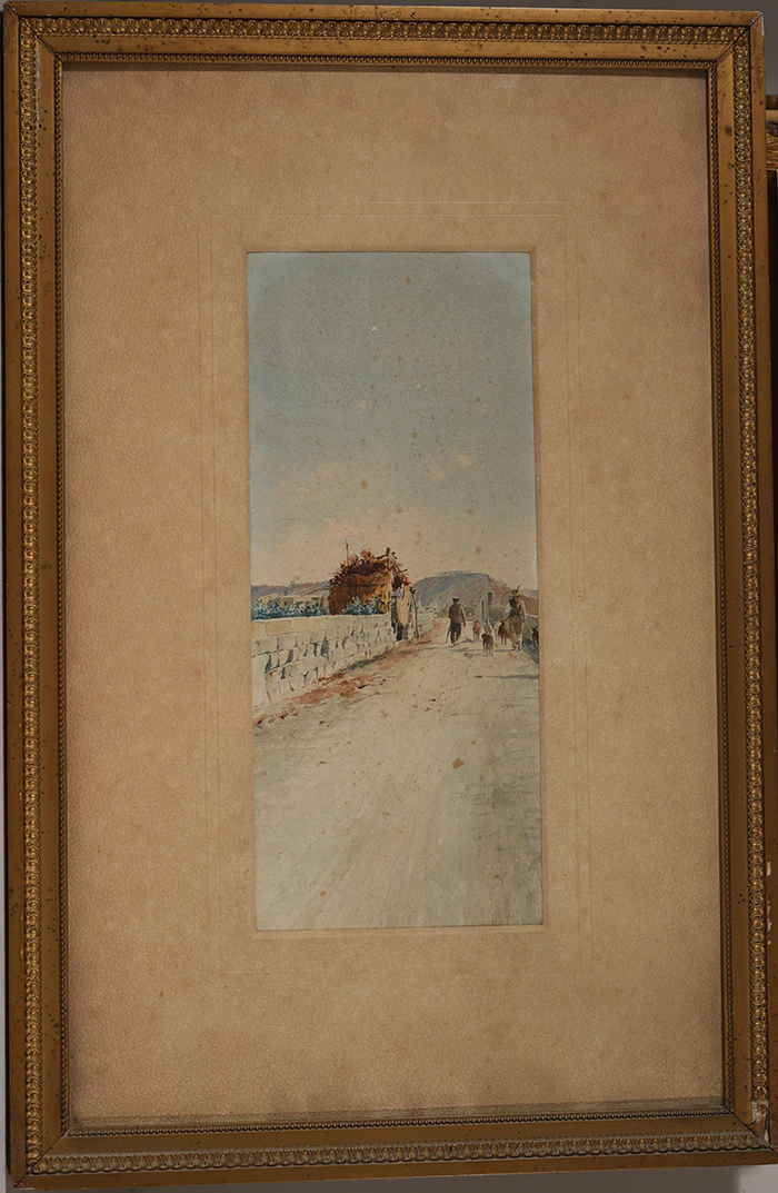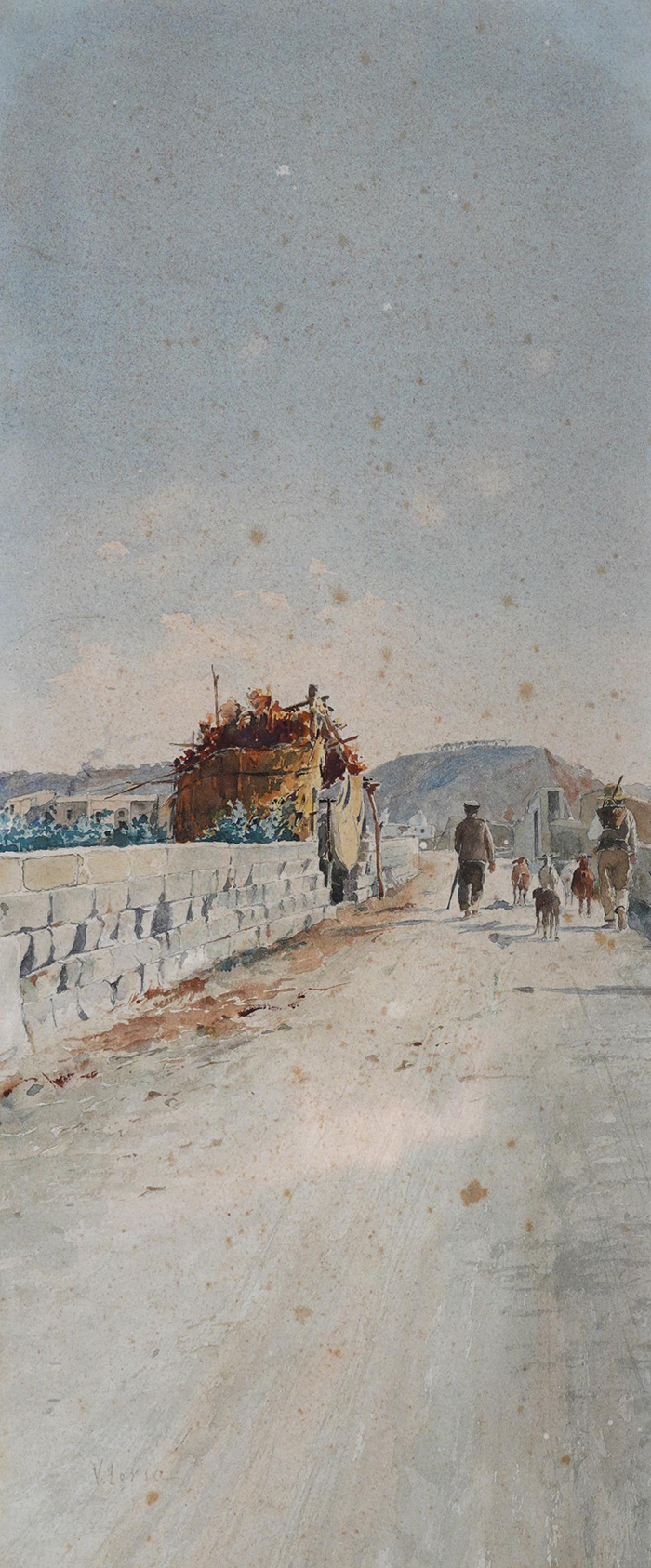 Loria Vincenzo (Salerno 1849 - La Spezia 1939) Strada di paese acquerello su carta, cm 36x15,5 firmato in basso a sinistra: V. Loria