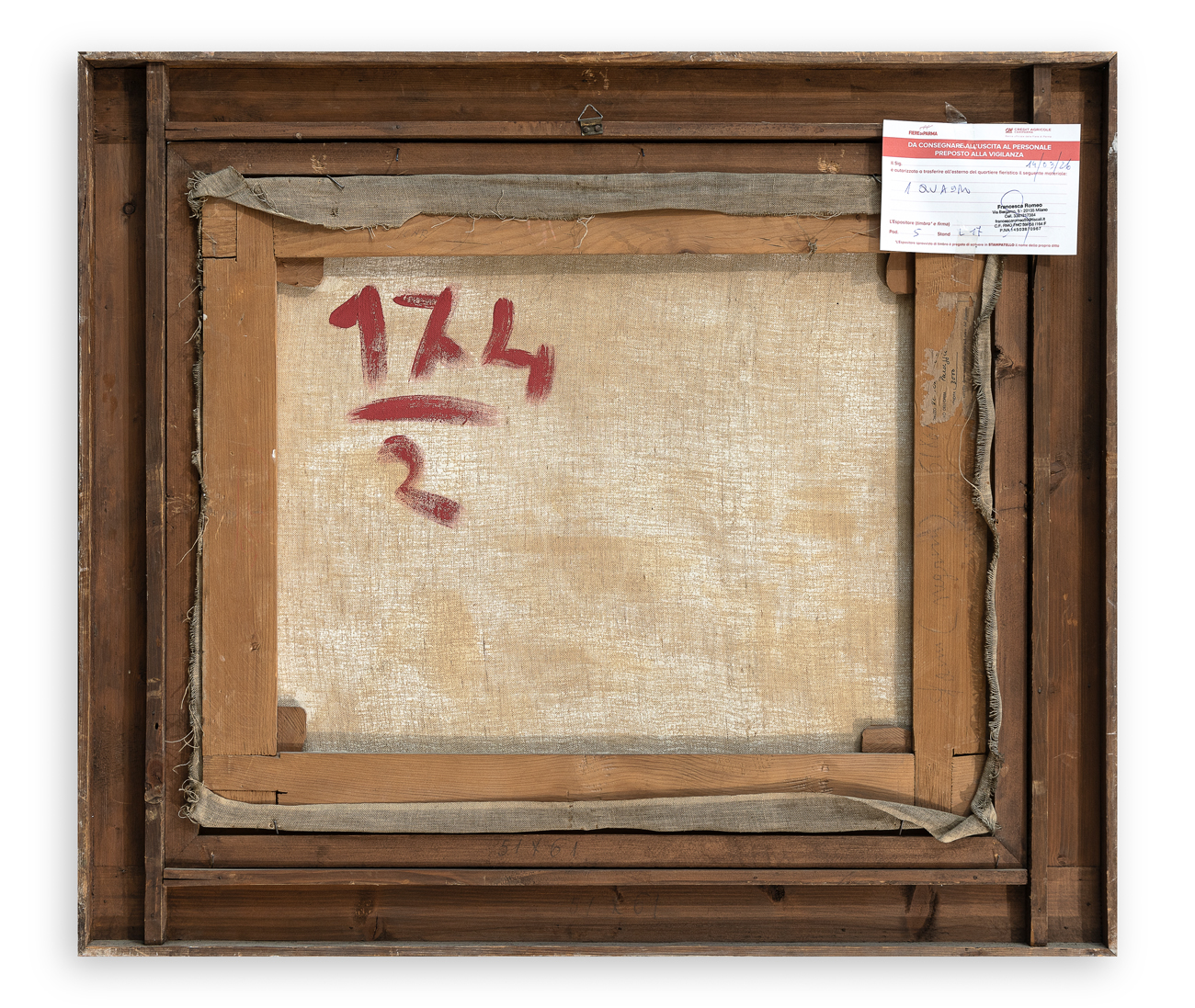 Etichetta parzialmente abrasa recante caratteristiche tecniche dell'opera al retro