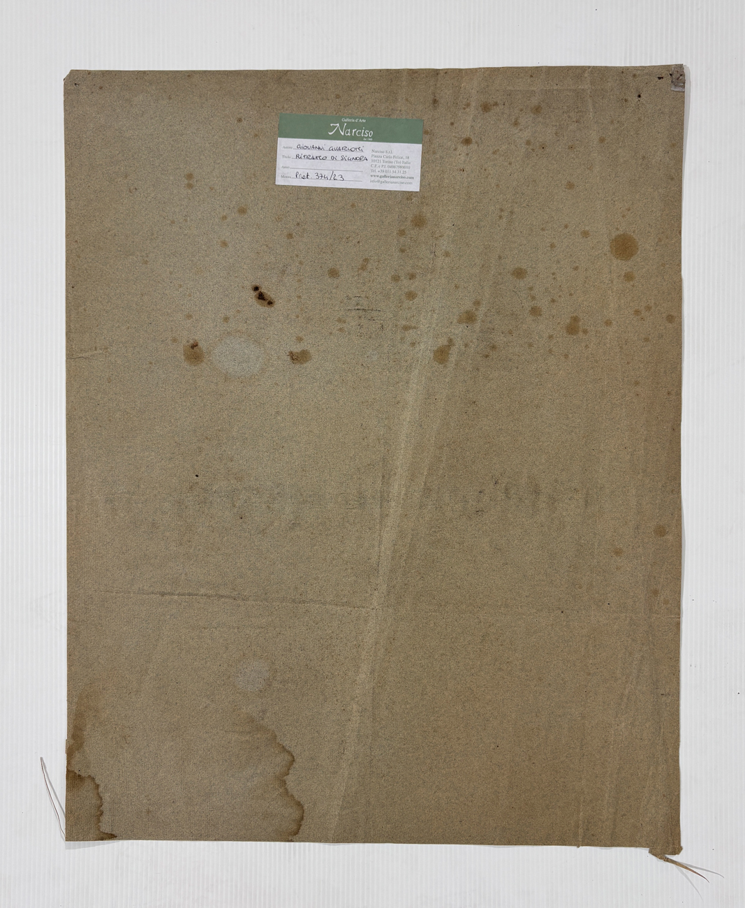 Etichetta della Galleria d'Arte Narciso (TO), con caratteristiche tecniche dell'opera e numero di repertorio, al retro