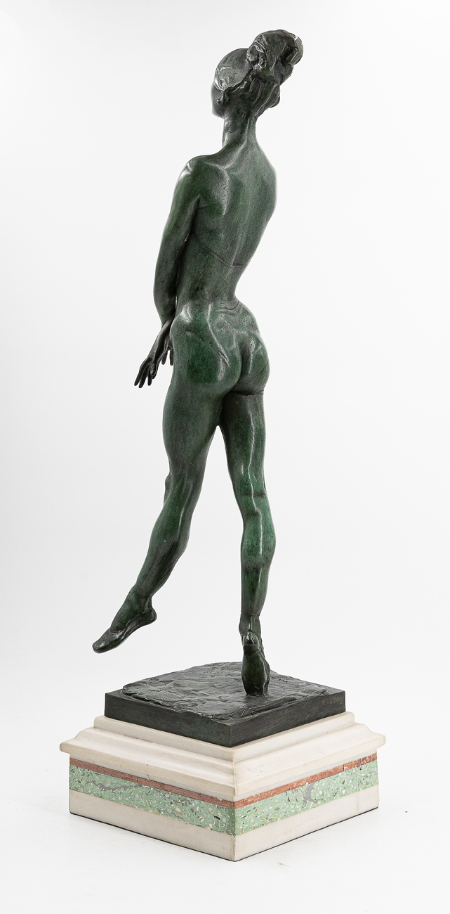 Scultura in bronzo a patina verde poggiante su base in marmo