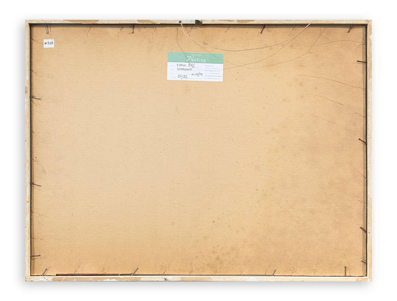 Etichetta della Galleria d'Arte Narciso (TO) con caratteristiche tecniche dell'opera al retro del cartoncino protettivo