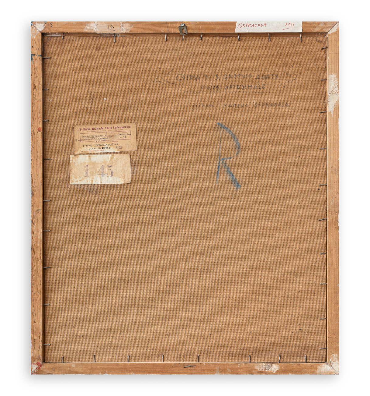Etichetta della 'V Mostra Nazionale d'Arte Contemporanea - S. Benedetto del Tronto - 1963' al retro della masonite protettiva