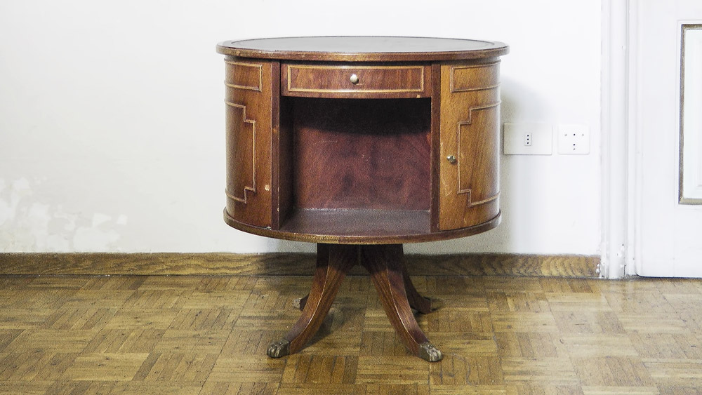 TAVOLINO GIREVOLE IMPIALLACCIATO IN NOCE Inghilterra, prima metà del XX secolo piano rivestito in cuoio impresso, corpo ovale con due sportelli laterali, sostegno centrale a quattro gambe a sciabola, piedi a zampa ferina in bronzo dorato, lievi difetti, una mancanza h cm 63,5x61x48 WALNUT VENEERED SWIVEL BAR CABINET