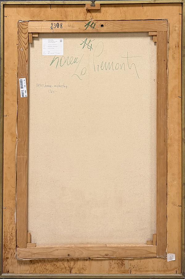 LORENZO PIEMONTI, "Macchina industria", 1965, olio su tela, cm 100x70. Al fronte: firma e anno in basso al centro. Al verso: firma, titolo, anno, etichetta con informazioni. Opera accompagnata da certificato di provenienza. Opera con cornice.