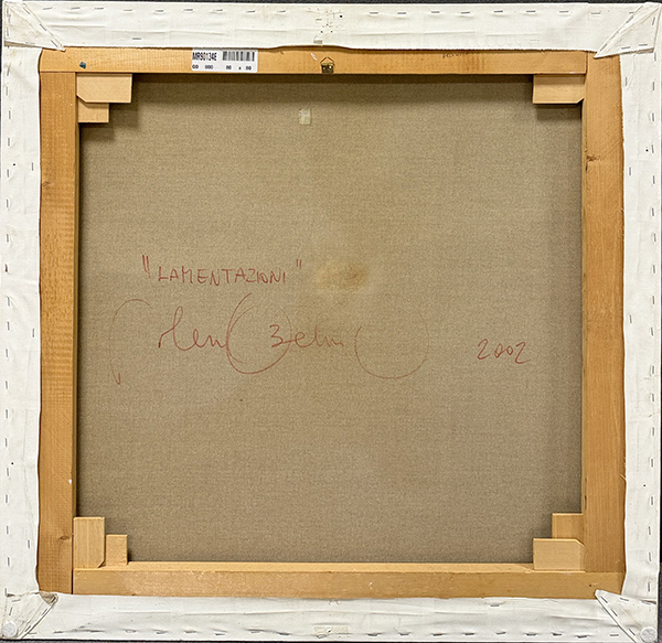 ALESSANDRO BELLUCCO, "Lamentazioni", 2002, olio su tela, cm 80x80. Al verso: titolo, firma e anno. Opera accompagnata da certificato di provenienza. Opera senza cornice.