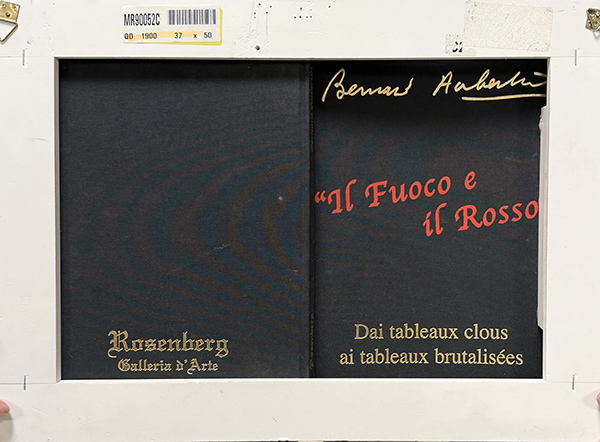 BERNARD AUBERTIN, "Livre brulee-Il fuoco e il rosso", tecnica mista su libro bruciato, cm 37x50. Al fronte: firma. Al verso: firma, titolo. Opera accompagnata da certificato di provenienza. Opera custodita in teca di plexiglass.