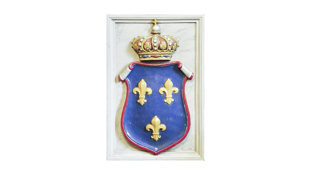 GRANDE STEMMA BORBONICO AD ALTORILIEVO IN TERRACOTTA SMALTATA Manifattura Cantagalli, inizio del XX secolo raffigurante uno scudo coronato con tre gigli d'oro in campo blu, su fondo dipinto ad imitazione del marmo, alcuni difetti h cm 72,5x47 GLAZED TERRACOTTA BOURBON COAT OF ARMS, MANIFATTURA CANTAGALLI, EARLY 20TH CENTURY