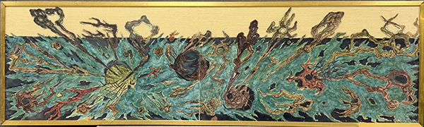 ANDREA RACCAGNI, Senza titolo, collage su tela riportato su tavola, cm 60x190. Al verso: firma. Opera accompagnata da certificato di provenienza. Opera con cornice.