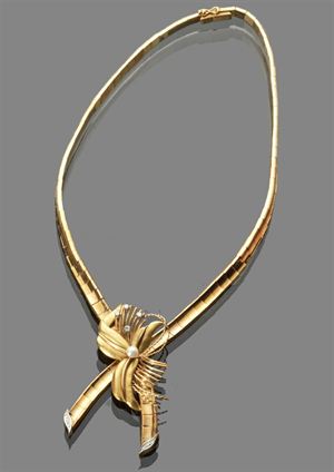 COLLIER Collier in oro giallo anni '40 con al centro perla e diamanti taglio...