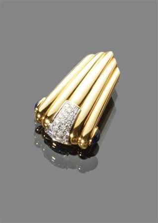 SPILLA Spilla dèco in oro giallo e oro bianco con zaffiri taglio cabochon e pavè di diamanti taglio brillante per complessivi ct 1,15 ca peso gr 23,70 Deco brooch in yellow gold and white gold with sapphire cabochon and pave diamonds totaling about 1.15 ct weight of 23.70 grams