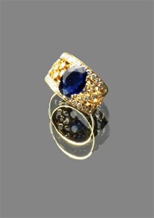 ANELLO Anello a fascia in oro giallo con zaffiro di taglio ovale ct 3,19 ca e diamanti taglio brillante per complessivi ct 0,81 ca peso gr 6,00 Band ring in yellow gold with 3.19 ct oval cut sapphire and brilliant cut diamonds approx totaling about 0.81 ct weight of 6.00 g.