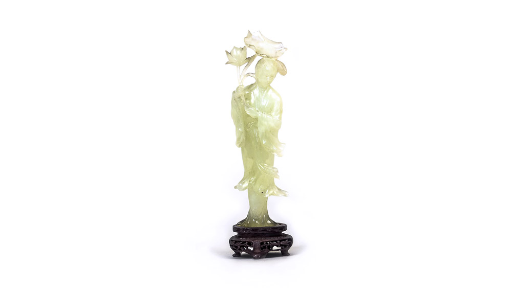 Lotto 114 | FIGURA IN GIADA Cina, XX secolo raffigurante una Quanin con fior di loto,...