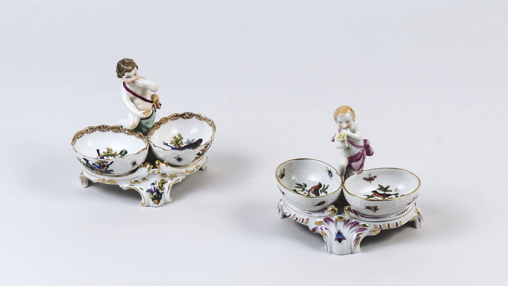 DUE DOPPIE SALIERE IN PORCELLANA Berlino e Herend, prima metà del XX secolo realizzate come due vaschette ovali su base rococò sormontate da puttini, entrambi dipinte con uccelli policromi e lumeggiature in oro TWO PORCELAIN DOUBLE SALTS, BERLIN AND HEREND, FIRST HALF OF 20TH CENTURY