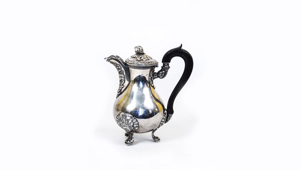 PICCOLA CAFFETTIERA IN ARGENTO Parigi, 1840 circa manico in legno ebanizzato, coperchio con presa a foggia di ghianda e trionfo di foglie, su tre piedini a ricciolo gr 310, h cm 18 SMALL SILVER COFFEEPOT, PARIS, 1840 CIRCA