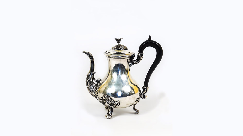 PICCOLA CAFFETTIERA IN ARGENTO Parigi, 1840 circa manico in legno ebanizzato, coperchio con presa a foggia di fiore, su tre piedini a ricciolo gr 300, h cm 18 SMALL SILVER COFFEEPOT, PARIS, 1840 CIRCA